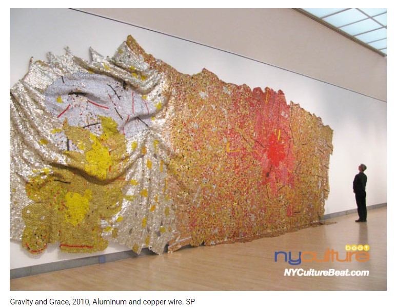 엘 아나츠이의 수행의 핵심에는 버려진 물질들이 놀라운 아름다움의 작품으로 변형되는 심오한 연금술이 있습니다. 이 변형 과정을 압축한 특히 대표적인 작품 중 하나는 "중력과 은혜"(2010)입니다. 수천 개의 알루미늄 병뚜껑과 구리 철사로 구성된 이 기념비적인 설치물은 역사와 기억의 조각들을 엮으며 광대한 공간을 가로지릅니다.